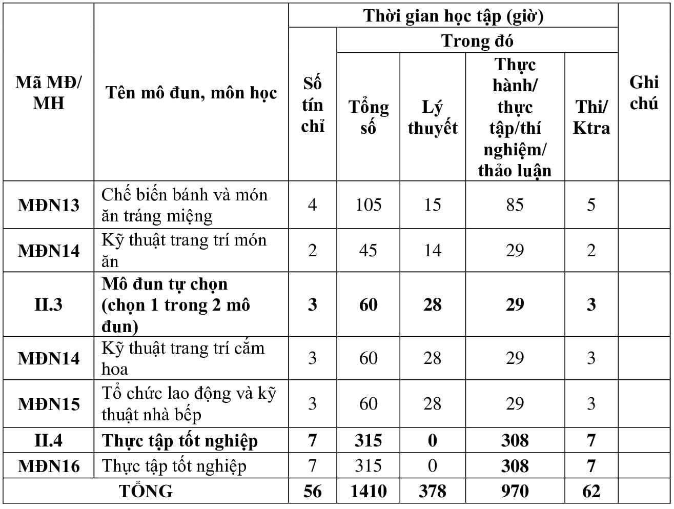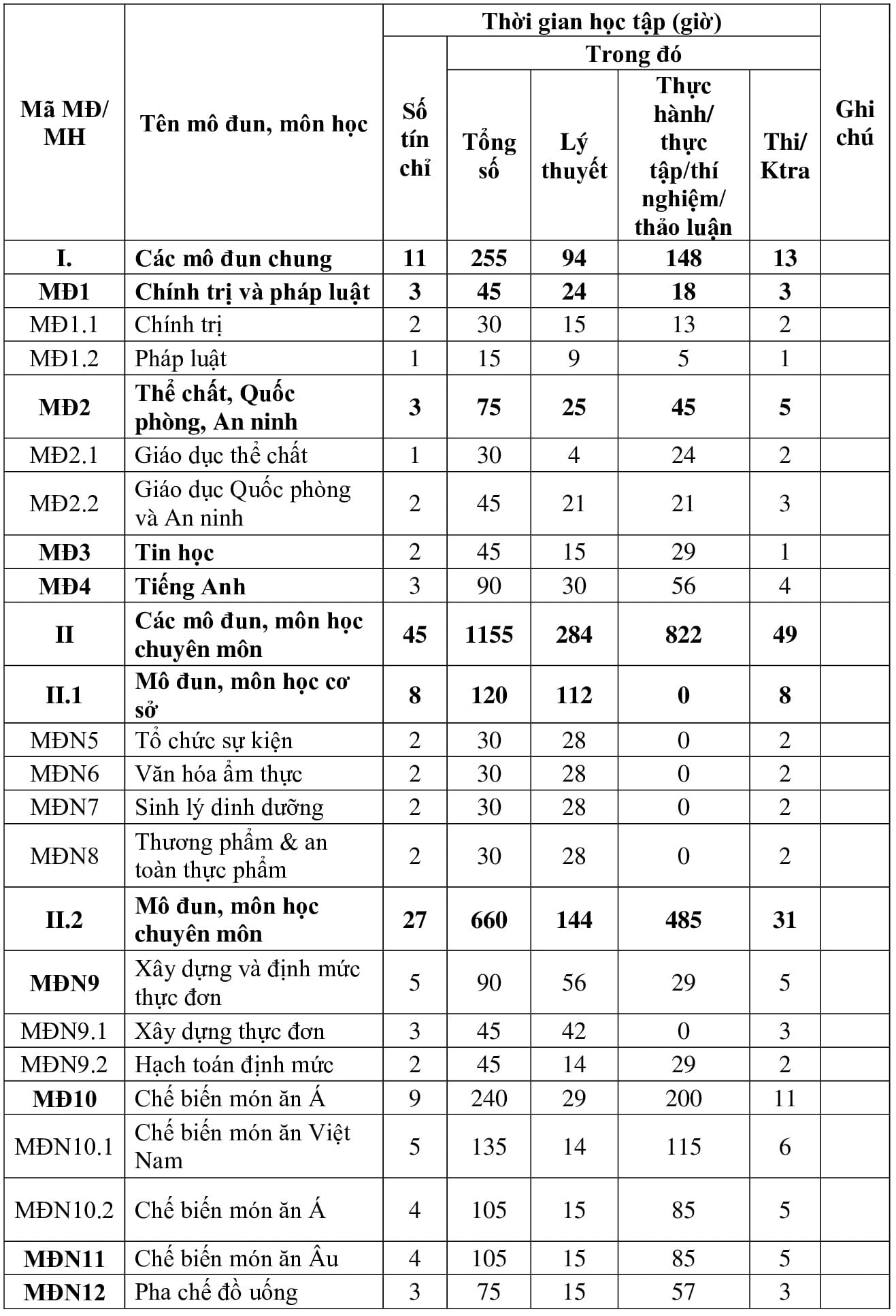 – Người học có được năng lực làm việc độc lập, tham gia làm việc theo nhóm, có khả năng ứng dụng kỹ thuật, công nghệ, có đạo đức, sức khỏe, lương tâm nghề nghiệp, có ý thức kỷ luật, tác phong công nghiệp, có khả năng tổ chức thực hiện các nhiệm vụ của nghề chế biến món ăn.