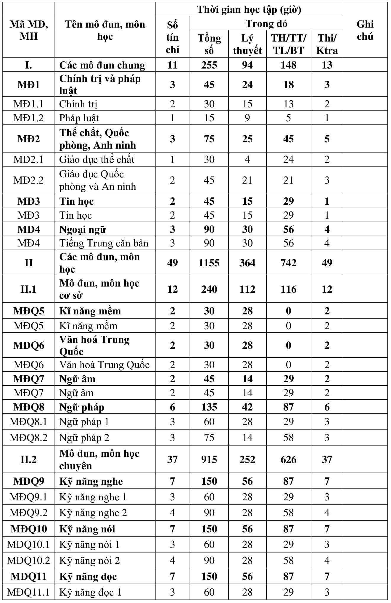 – (!): Các môn học Giáo dục thể chất và Giáo dục quốc phòng – An ninh được tổ chức giảng dạy theo lịch riêng