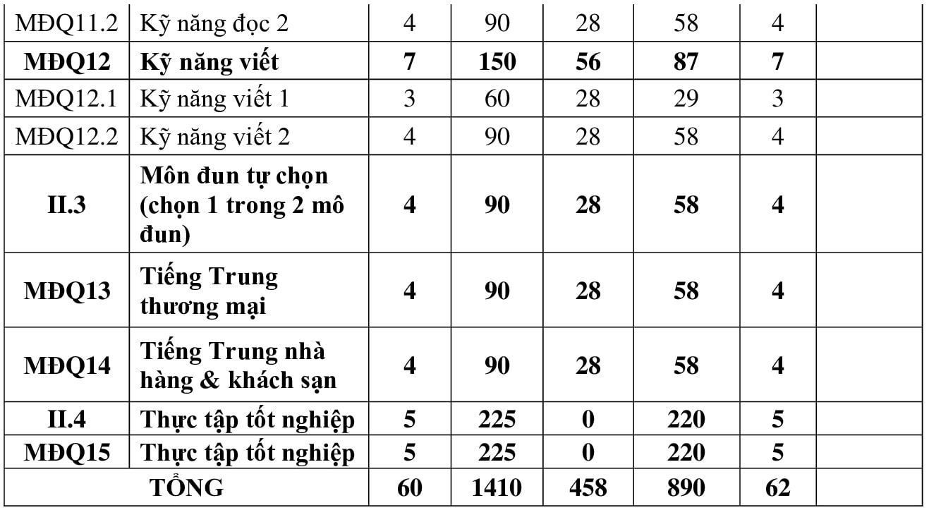 Chương trình đào tạo trình độ trung cấp ngành Tiếng Trung Quốc chuẩn bị cho người học các kỹ năng cơ bản: Nghe, nói, đọc, viết bằng tiếng Trung gắn với các công việc có sử dụng Tiếng Trung, đáp ứng yêu cầu Bậc 3 theo Khung năng lực ngoại ngữ 6 bậc dành cho Việt Nam, tương đương cấp độ B1 theo Khung tham chiếu chung Châu Âu (CEFR).